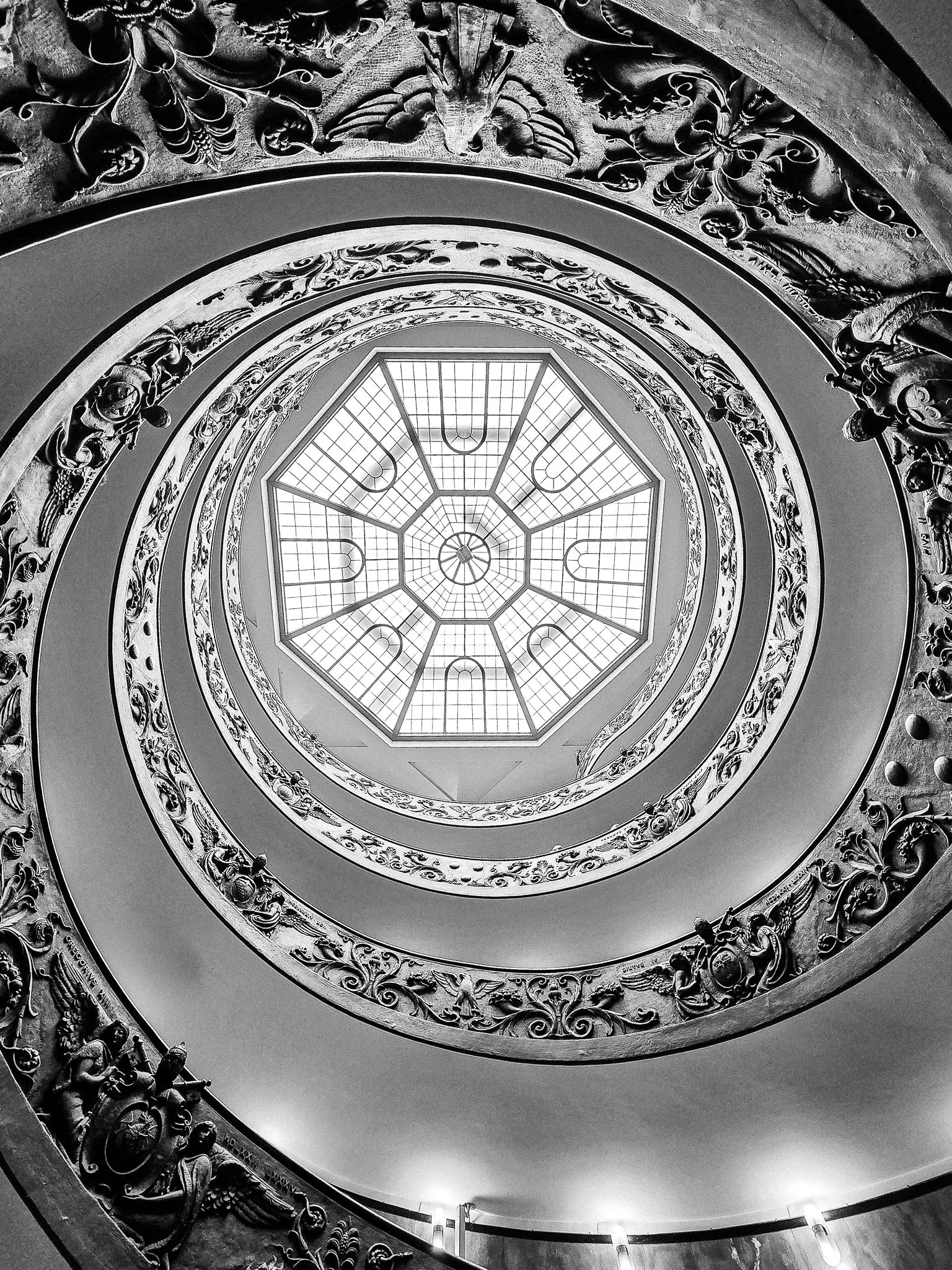 Finally, no trip to the Vatican is complete without that shot of the Bramante Staircase. I aimed the camera straight up into the spiral. The geometric precision of this phone's lens is fantastic—the lines remained perfectly curved without weird distortion. I converted this one to black and white as well, which emphasized the abstract, rhythmic nature of the spiral and the metallic gleam of the railing.